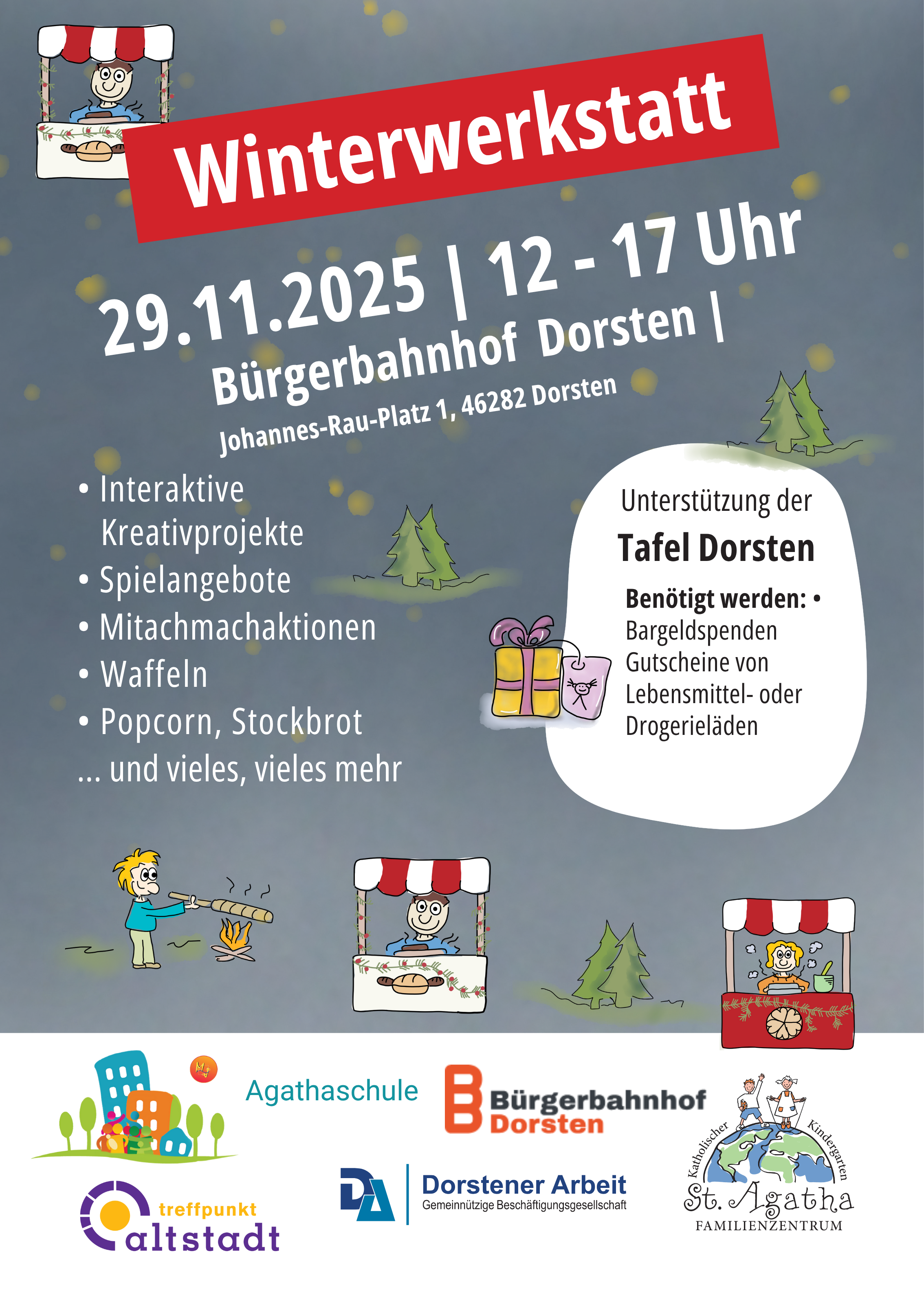 Kleiner Adventsmarkt für Familien mit Kindern rund um den Bahnhof.
