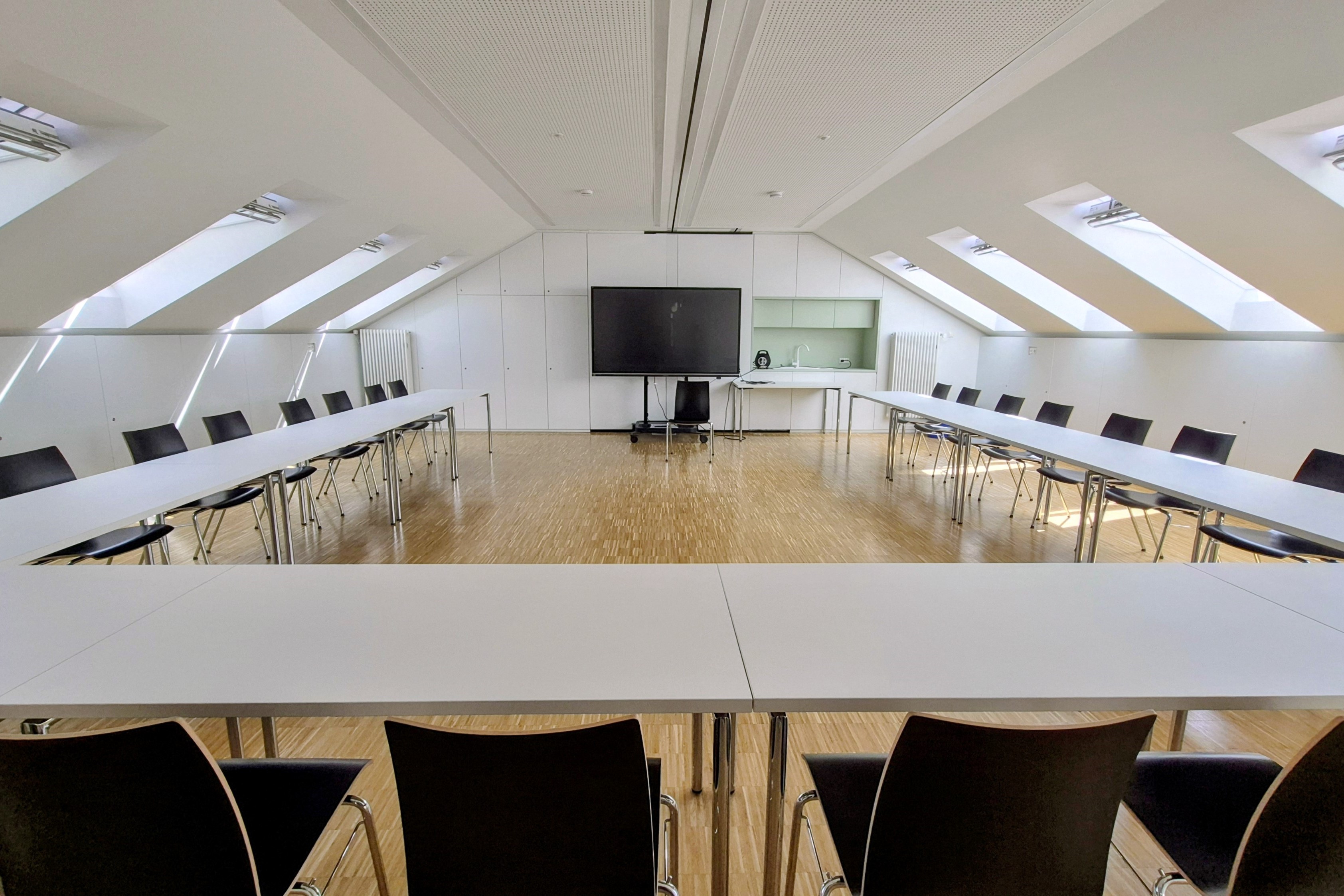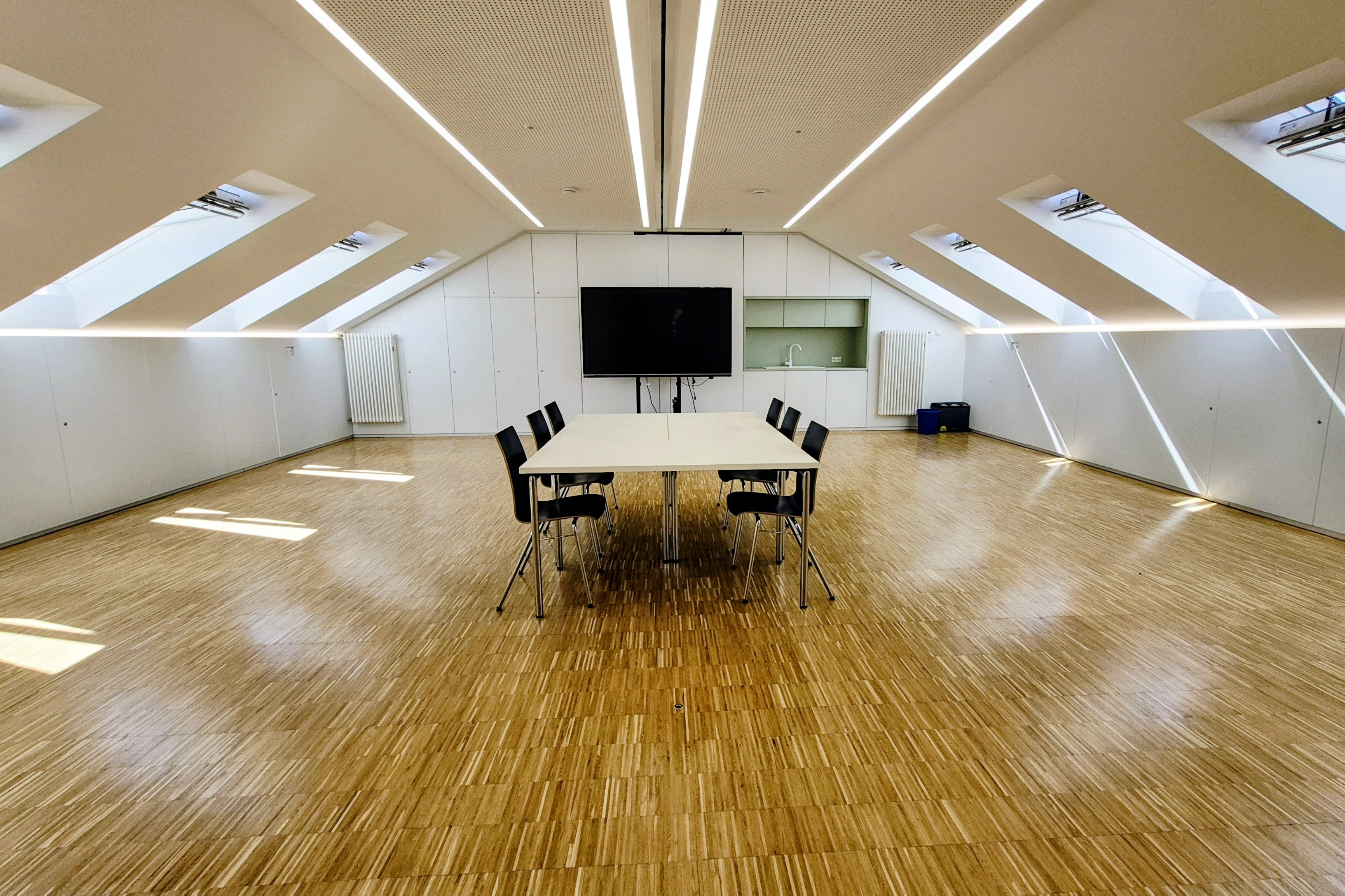 Die Räume 120 und 121 sind mittels einer mobilen Trennwand voneinander separierbar und verfügen über eine variable digitale Tafel. Eine kleine Teeküche erlaubt es, sich ohne große Umwege direkt in der Räumlichkeit zu erfrischen.